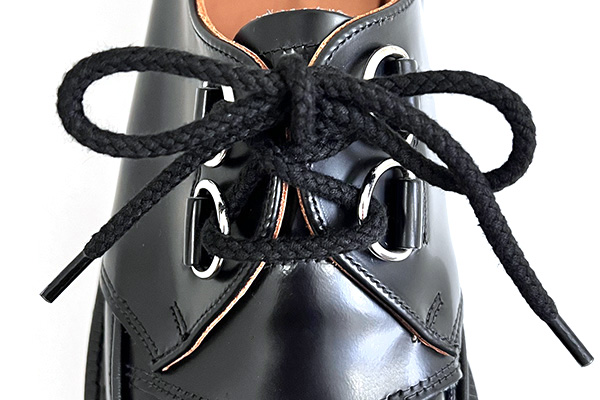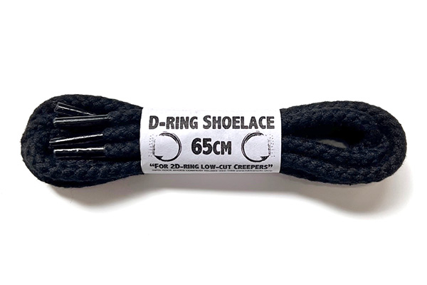 ROCK SHOES COMPANYオリジナルのローカットクリーパー用 Dリング対応シューレース(65cm/ブラック)です。 GEORGE COXのSKIPTON(3588)や8961、DACEなどに採用されている「Dリング2つタイプ」のローカットラバーソールに合わせて製作しました 編み込みタイプで同仕様のシューレースが日本ではほとんど流通していないため、当店でサンプリングを行い製作しています。 本商品は左右計2本の1ペアセットです。人の手によって生産されているため長さは多少の個体差がありますので、目安としてお考えください。 ※本商品はGEORGE COX社製ではなく、ROCK SHOES COMPANYのオリジナル製品です。純正品ではありませんが、Dリングタイプに適した通しやすさや見え方、長さのバランスまで考えて仕上げた交換用シューレースです。